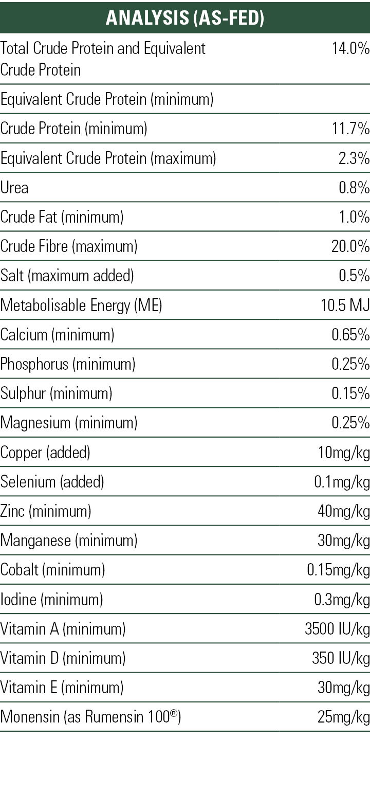 - Suitable for feeding to cattle weighing greater than 120kg live body weight.