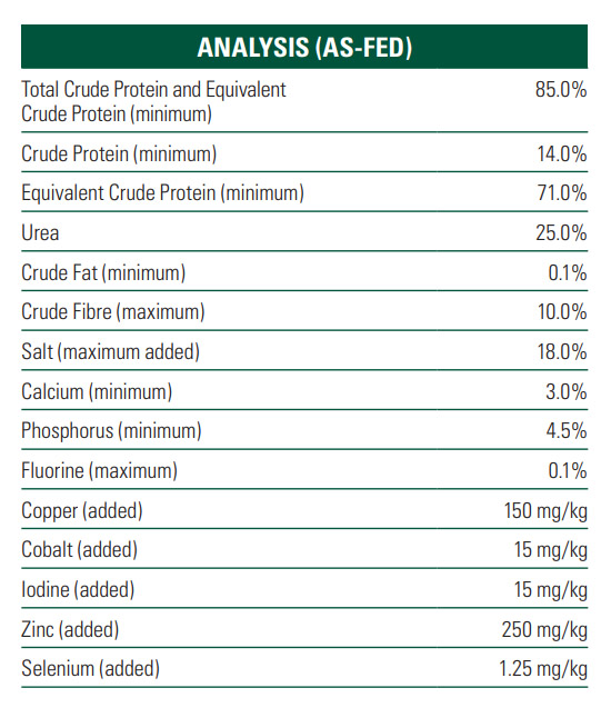 - Contains urea, vegetable protein meal, major and trace minerals.